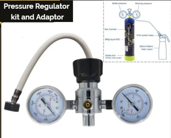This value combo set includes a Swag and Lux whip Max 580g & 2-2L and 3.3L cream charger and a pressure regulator. Creamy Max 580g &2.2L and 3.3L cream chargers are filled with 99.9% pure food grade N2O. With pressure regulator, you can easily fill in the N2O into whipper.